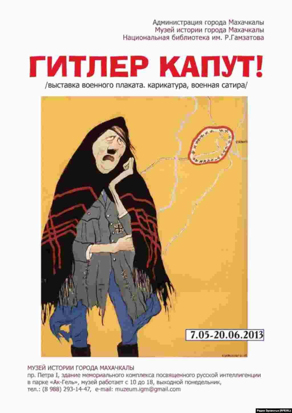 7 маялда МахIачхъала шагьаралъул тарихалъул музеялда тIобитIана «Гитлер капут!» абураб экспозиция. Гьенир рихьизе лъун руго КIудияб ВатIанияб Рагъулги гьелда хадусел соназдаги рахъарал карикатураби, рагъулаб сатираялъул асарал. Гьезул авторал релъулел руго Гитлерил фашизмалда тIад. Экспозициялде щвана нижер мухбир Зульфия ХIажиева.