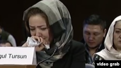 В Конгрессе США Мехригуль Турсун с помощью переводчицы рассказала о своем содержании в синьцзянском лагере перевоспитания.