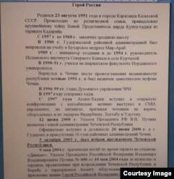Текст биографии распечатан на одной странице. "Кавказ.Реалии" располагает его копией. Бумага была распространена в одном из отделений региона.