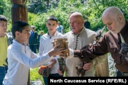 На соседнем холме полощется красное знамя святилища. С одной стороны – крест, с другой – дракон. Рядом – беседка со столом и резными стульями. Здесь заседают хистары – трое старейшин. На столе – голова и шея жертвенного быка. Коротко стриженный старик в коричневой осетинской рубахе с веревочными узлами вместо пуговиц поднимает глиняную чашу с пивом. Первый тост, по традиции, за Великого Творца. Сотни паломников замерли. Оратор протягивает чашу мальчику. Тот послушно делает глоток и заедает его пирогом из рук старейшины. Тут же десятки ножей вонзаются в тесто, сотни стаканов опрокидываются в глотки. Начинается кувд. Второй тост хистар поднимает за Уастырджи, третий – за причину, по которой здесь все собрались, как собираются уже много лет в назначенную июньскую субботу. За Реком.